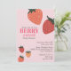 Este convite de chá de fraldas personalizado apresenta um tema de fruta de morango giro em um fundo cor-de-rosa suave. Dois morangos grandes são colocados no canto superior direito, com três bagas menores no canto inferior esquerdo. A frase "Berry Sweet" é impressa em uma fonte rosa grande acima do título do evento.
