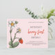 Um doce convite de morango cor-de-rosa para comemorar seu primeiro aniversário. Ilustração adorável de uma planta de morango com flores e um morango. Personalize com suas próprias informações.