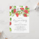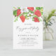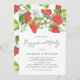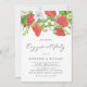 Convide familiares e amigos com este convite de festa de noivado de morango botânico. Apresenta a ilustração aquosa de morangos, folhas de flores brancas com um padrão de bagas correspondente. Este convite floral é perfeito para primavera e noivados de verão. Personalize adicionando o nome, a data, a hora, o endereço e outros detalhes do evento do celebrante.