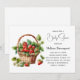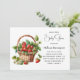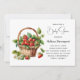 Convite de chá de bebê com uma ilustração fofa apresentando morangos frescos colhidos enchendo uma cesta de vime charmosa.