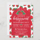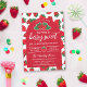 Um convite de aniversário de amora doce para qualquer idade, com o seu convite de formulação em branco, contra uma forma de arca vermelha e contra um fundo de morangos em vermelho. Detalhes do morango bonito, como um casal de morangos vestindo arcos verdes.