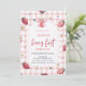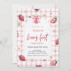 Um convite de chá de fraldas bonito apresenta morangos de cor aquosa e fundo de xadrez vermelha. Estes convites de aniversário são facilmente personalizados para o seu evento simplesmente adicionando os seus detalhes. Este charmoso convite combina perfeitamente padrões de gingham eterno com sotaques de morango doce, criando um design delicioso e sofisticado que dá o tom para uma festa de aniversário memorável.