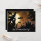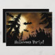 Um castelo gótico escuro e assustador de halloween, brilhando sob uma vasta lua brilhante num céu devastado, cheio de morcegos. Um convite de festa de excelente gótico para o Dia das Bruxas. Mais sombrio e assustador na Loja Estranha do Paul Stickland no Zazzle.