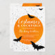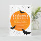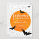 Costumes e cocktails! Celebre o seu Dia das Bruxas assustador e convide amigos e família com esta lua de cor laranja moderna e simples e elegante, esplendores negros, morcegos e tipografia. O fundo da cor é totalmente editável, você pode mover os morcegos.