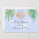 Bebê Garoto Sloth Blue Drive Por Convite Ao Chá de fraldas. Este chá de fraldas bonito apresenta uma doce preguiça de bebê pendurada num galho, emoldurada com folhas verdes e nuvens de cor d'água sobre fundo azul. O verso também é azul e decorado com folhagem, nuvem e espaço para mais informações. Original Watercolor © Michele Davies.