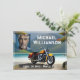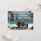 Anuncie a vida do seu ente querido com esta carta que apresenta uma bela ilustração de uma motocicleta estacionada perto de um lago.