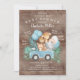 Adorável convite de chá de fraldas com um carro azul com tigre, leão, girafa e elefante com folhas verdes da selva e balões azuis. Convite perfeito para chá de distância social para uma unidade por chá de fraldas. Visite nosso compro para ver este convite para um chá de meninas.