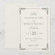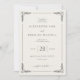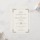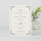 Este convite de casamento elegante apresenta um layout clássico orientado verticalmente com amplo espaço em branco e um fundo bege claro. O design inclui uma borda intrincada de motivos de folhas estilizadas em cada canto, adicionando um toque de sofisticação. A tipografia combina letras cursivas para toques pessoais e fontes serifadas em negrito para detalhes importantes, criando uma aparência atemporal e formal. Perfeito para casais que buscam uma estética tradicional, porém refinada, este convite estabelece o tom para uma celebração memorável.