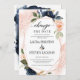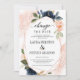 Design moderno e elegante impresso em Azul-Marinho e Rosa Bege Floral e Quadro Geométrico, Convite de Mudança de Planos que pode ser personalizado com o seu texto. Por favor, clique no botão "Personalize" e use nossa ferramenta de design para modificar este modelo. Confira a loja de Arte Gráfica para outros produtos que combinam com este design!