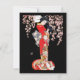 Linda imagem de uma mulher asiática com fã, de vestido tradicional. A cerejeira floresce de cima com o céu iluminado como pano de fundo. A noite escura de fundo preto, ela está vestindo um vestido vermelho florado.