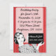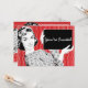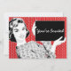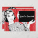 Mulher da Vintage, de 1950, segurando uma placa sobre um fundo de bolinhas brancas e vermelhas. Personalize-o com o seu próprio texto e cor de fundo. Legal!