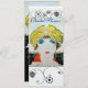 Vibrante, estilizada ilustração de alta moda Art Déco francesa com espirais geométricas, círculos. Retrato de uma jovem elegante e bonita usando um chapéu oriental amarelo com penas em preto, branco, amarelo, azul e vermelho. Convite de festa moderno, artístico e sofisticado.