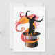 Esta design é uma mulher silenciada dançando em um chapéu. Ela está literalmente em um chapéu de cima e tem uma espiral de fundo laranja atrás dela. Essa mulher dançando de chapéu alto parece excelente nesses convites
