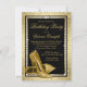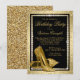 O elegante convite de aniversário preto e ouro da mulher com belos calçados de alto salto de ouro em um elegante fundo brilhante de diamante preto e ouro. Esses elegantes convites de festas de aniversários preto e ouro são facilmente personalizados para seu evento simplesmente adicionando seus detalhes no estilo de fonte e na redação de sua escolha.
