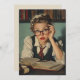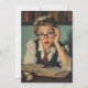 Uma jovem de roupa de vintage, vestindo óculos, olha esmagada enquanto estuda em uma mesa cheia de livros abertos. O cenário se assemelha a uma cena acadêmica dos anos 50.