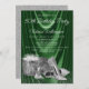 Mulheres convites de aniversário verdes e prateadas com calçados bonito de salto alto prateado, garrafa de perfume e presentes num lindo fundo verde de cebola. Este convite de aniversário verde para mulheres é facilmente personalizado para o seu evento simplesmente adicionando os seus detalhes do evento.