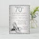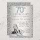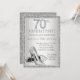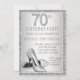 Convite de aniversário 70 da mulher com números elegantes de diamante prateado e calçados de salto alto brilhando em um lindo fundo brilhante prateado. Personalize este convite de aniversário prateado maravilhoso simplesmente adicionando seus detalhes no estilo de fonte e na cor de sua escolha.