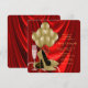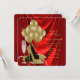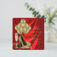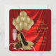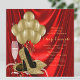 Convite de aniversário vermelho e dourado da mulher, com belos calçados de salto alto com brilho dourado, balões de ouro, champanhe e pérolas em fundo vermelho de cebola. Este elegante convite de aniversário vermelho e dourado é facilmente personalizado para o seu evento simplesmente adicionando os seus detalhes no estilo de letra e cor, texto e layout da sua escolha. Você também pode mover ou excluir o champanhe e os balões. Esta é uma design impressa sem joias reais, pérolas, brilho, etc.