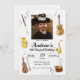 O convite para fotos simples e elegante para o aniversário de um garoto musical. Instrumentos musicais de aquarela sobre fundo brilhante com notas de cinza clara. Uma capa frontal será uma escolha excelente para o design. Carregue sua própria foto e ajuste-a para um chapéu de música.