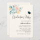 Convite de festa de formatura com uma ilustração bonito de aquarela. Um buquê de flores cor-de-rosa e azuis cercado por folhas verdes e galhos. Um boné de formatura acima do texto.