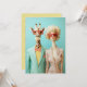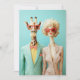 Uma imagem surreal do estilo pop-art com uma girafa e uma mulher glamourosa vestida de roupas elegantes e inspiradas na safra. Ambos vestem óculos de sol vermelhos sobredimensionados, exuando charme de alta moda contra um fundo de turquesa pastel.
