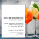 Um branco moderno e minimalista com texto de cinza, um cocktail para aquecimento doméstico, para que você convide seus amigos e associados a ajudá-lo a celebrar sua nova moradia.