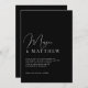Este convite para casamento moderno é simples, na moda e tão chique a preto com texto branco. Usando uma combinação exclusiva de letras de guião manuscrito e serif elegante para os nomes da noiva e do noivo adiciona um estilo distinto contemporâneo. Todo o texto é justificado à esquerda por um elegante olhar e sentir contemporâneo. Esse olhar clássico limpo com o detalhamento na moda do nome da noiva adiciona esse pop especial de estilo, mantendo a simplicidade de um design minimalista. Há muito espaço em branco no convite que oferece uma apresentação limpa e desordenada. O estilo dos nomes da noiva e do noivo cria seu próprio logotipo de casamento pessoal para usar em outros artigos de papelaria e produtos correspondentes nesta suíte. Quando você personaliza este convite com seu texto, o nome da noiva pode precisar ser mudado para o lugar, dependendo da primeira letra do nome dela. As supressões na bela letra do roteiro da letra principal do seu nome podem mudar. Basta selecionar "editar usando design modelo" na parte inferior da área em que você está personalizando o texto. Isso abrirá o editor Zazzle do cheio, dando-lhe a capacidade de mover e reposicionar o nome da noiva, como desejar. Estes convites estão disponíveis nos formatos de download impresso e digital para sua conveniência! Uma escolha excelente para casamentos em qualquer estação do ano - primavera, verão, outono e inverno.