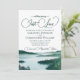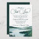 Este convite de casamento rústico mostra uma cena de aquarela do lago Tahoe cercado por pinheiros verdes da floresta com montanhas ao fundo. O título diz: Nada de Rico, Apenas Amor, e é escrito em letras elegantes. A parte de trás é uma cor verde florestal profunda marmoreada. Whimsical, romântico e elegante, este convite é perfeito para um casamento de destino ao ar livre.