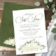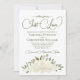 Este belo convite para o casamento apresenta um design floral de aquarela rústica com um aglomerado de rosas pintados à mão e flores em tons de branco, marfim e creme com folhas de eucalipto folhagem e verde. No topo estão as palavras: "Nada de rico, Apenas Amor", soletradas em letras elegantes, com baloiços e flores. A parte de trás do convite é uma cor verde-sábio marmoreada, com um buquê de floração e folhagem amarrada com um arco de cetim.