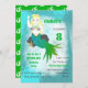 Fantasia bonito convites de aniversário de Sereia com uma bela ilustração de sereia em tons de azul-turquesa, verde-esmeralda e branco, tão fofos e caprichosos, As costas têm um padrão de sereias-natação em verde e branco. Personalize-o com a idade e os detalhes da festa de aniversário da sua aniversariante.
