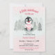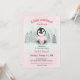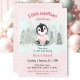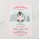 Um pouco de amor está a caminho! Chamada de chá de fraldas de inverno com uma adorável menina de pinguim com um coração cor-de-rosa na floresta gelada. Perfeito para um chá de fraldas de inverno e perto do Dia de os namorados. Personalize facilmente o texto. Kate Eden Art