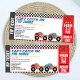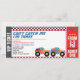 O convite para aniversário de 3 anos de passagem de caminhonete monstros desenhado como um bilhete de admissão VIP com caminhões monstros coloridos e bandeira de controlo.