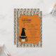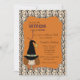 Uma bruxa adorável, com um sorriso grande no rosto, é uma escolha excelente para um convite para a Festa de Halloween. O painel laranja é colocado sobre um campo de ramos e folhas do outono.O cartão é fácil de personalizar com seu texto, fonte, cor da fonte e escolha de seis tipos de papel.