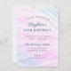 Este convite para o aniversário de folhas tropicais pintado é perfeito para uma festa de aniversário de verão. O design apresenta uma textura foliar tropical pintada, rosa e azul, para uma sensação moderna e divertida de verão.
