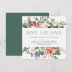 Esses elegantes cartões de salvar a data do casamento de Natal apresentam flores rústicas em aquarela com pinhas, galhos, frutas vermelhas, folhas e rosas brancas.