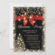 Um convite elegante para festas de férias, com uma árvore de Natal dourada, estrelas, luzes de cordas e arco vermelho sobre fundo preto. Estes belos convites de Natal são perfeitos para convites de festas de janto de Natal, convites para troca de presentes de Natal, angariadores de fundos de Natal, convites para bolas de férias e outros eventos realizados durante o mês de dezembro. Use apenas os campos modelo para adicionar suas próprias informações de evento.