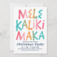 Tema havaiano O convite de festas de Natal apresenta a tipografia "Mele Kalikimaka" em cores tropicais com seus detalhes de evento em azul marinho. Perfeito para comemorações de temas tropicais, praias, litorais e insulares. Arte por KL Stock