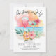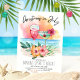 Tema tropical O Natal de julho apresenta um pôr de sol de praia em aquarela, coquetéis, flores de hibisco e folhas de palma com uma legenda de "Natal em julho" em letra de estilo manuscrita. Perfeito para a família de verão se reunir, reuniões, festas de férias antecipadas ou atrasadas, etc.