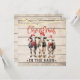 Aproveite este convite para festas de Natal no celeiro, fofo, com tipografia vermelha e marrom, três vacas holstein vestindo chapéus vermelhos de Papai Noel e luzes de cordas. Fundo de conselho de madeira leve. Modelos para uma família se reúnem de volta.