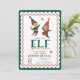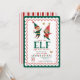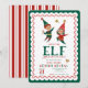 Que elfo eles estão tendo? Este convite revelador de Natal bonito é perfeito para a época das Férias. Os elfos ilustrados dançam acima da manchete "o que os elfos estão tendo". Personalize o texto com suas informações de revelação de gênero. A design está em vermelho e verde com sotaques de ouro e um padrão de trás da cana-de-vela.