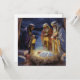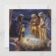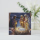 Compartilhe o verdadeiro significado do Natal com este lindo cartão de Natal plano com uma ilustração tradicional da cena de Natividade. Este design artístico retrata os Três Reis Magos oferecendo presentes ao bebê recém-nascido no presépio sob a brilhante Estrela de Belém em um estábulo pacífico e rústico. As cores profundas, o céu noturno estrelado e a luz dramática criam uma imagem reverente, evocativa e atemporal. Este cartão é uma maneira elegante e significativa de enviar saudações de Natal e votos de paz e alegria para a temporada.