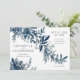 Convite de casamento interessante, moderno e elegante, com flores e folhas de índigo azuis em aquarela. Florais pintados com contornos. Uma placa exclusiva com um design horizontal.