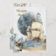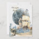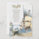 Este convite náutico de casamento por aquarela apresenta um belo navio com velas e âncora velejando em frente a uma lua de cheio. No fundo, há ondas e rochas colocadas sobre um fundo de textura falsa e esbranquiçada. O verso tem o texto do convite enquadrado e é decorado com bonito arranjos de flores. -