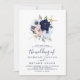 Este convite de casamento floral floral moderno é perfeito para um casamento de cruzeiro ou praia. O design branco apresenta flores cor-de-água, cor-de-rosa-claro e marinho, cor-de-rosa-claro, com sotaques dourados, dando-lhe uma vibração da praia. A parte traseira apresenta faixas de aquarela marinho azul e branca.