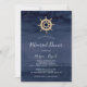 Este janto de ensaio náutico moderno de hélio é perfeito para um ensaio de cruzeiro ou de casamento na praia. O simples design apresenta uma roda de barco dourada sobre um fundo de marinho azul-d'água.