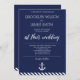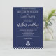 Convites de casamento náuticos com riscas azuis e brancas marinhos, âncora branca e texto branco personalizado, quando o casal hospeda com as suas famílias, impressos em fundo azul marinho
