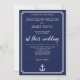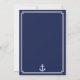 Convites de casamento náuticos com quadro branco, âncora branca e texto branco personalizado, quando o casal acolher as suas famílias, impressos em fundo azul marinho