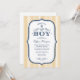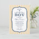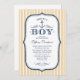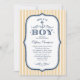 Os convites náuticos do chá de fraldas com azuis marinhos, ouro e a listra branca projetam para um bebé. O texto principal diz "Ahoy! É um menino". Personalize o fraseio com sua informação do chá de fraldas. Inspecione exatamente o que terminados convidam olharão como na tela antes que você peça.