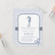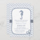 Este convite náutico moderno, contemporâneo, elegante e à moda do chá de fraldas é perfeito com para que as mamães sejam quem está esperando um bebé! Tem uma paleta de cor azul pastel, um design do cavalo marinho e a beira da corda com um nó. Fundo elegante do teste padrão de ziguezague azul e branco da viga. Personalize facilmente com detalhes do partido.