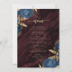This elegant wedding menu features blue floral bouquets set off with gold faux foil greenery in two corners, on a background image of burgundy watercolor agate. The customizable text combines gold-colored serif and handwriting fonts. The reverse side features a matching floral and agate design.